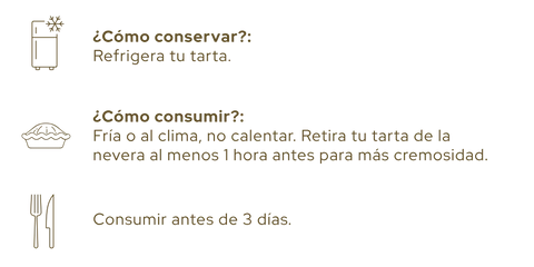 La tarta está en su mejor punto el día de la entrega. Si vas a consumirla ese mismo día, no es necesario refrigerarla. Sin embargo, si vas a disfrutar de tu tarta al día siguiente o después, recomendamos guardarla en nevera y sacarla 2 horas antes de consumirla. Consúmela en máximo 4 días.